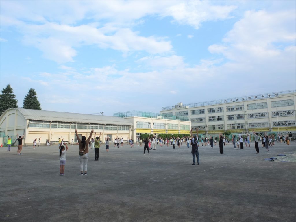四宮小学校の広い校庭いっぱいに 広がって 全国ラジオ体操連盟公認1級指導士・鉾立和子氏のご指導のもと、3年ぶりに開催することができました。「早朝から体を動かすのは気持ち良いですね」とのご感想もいただいています。