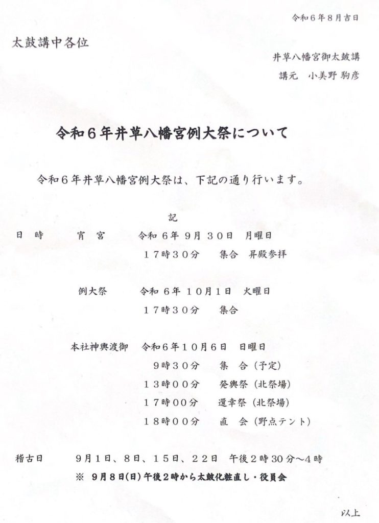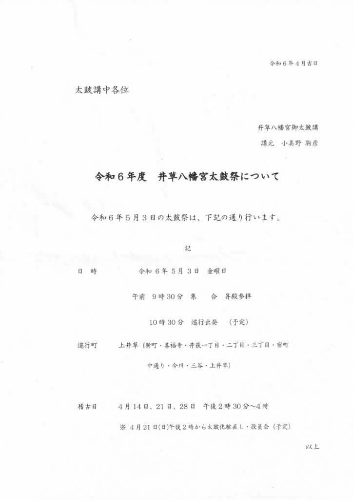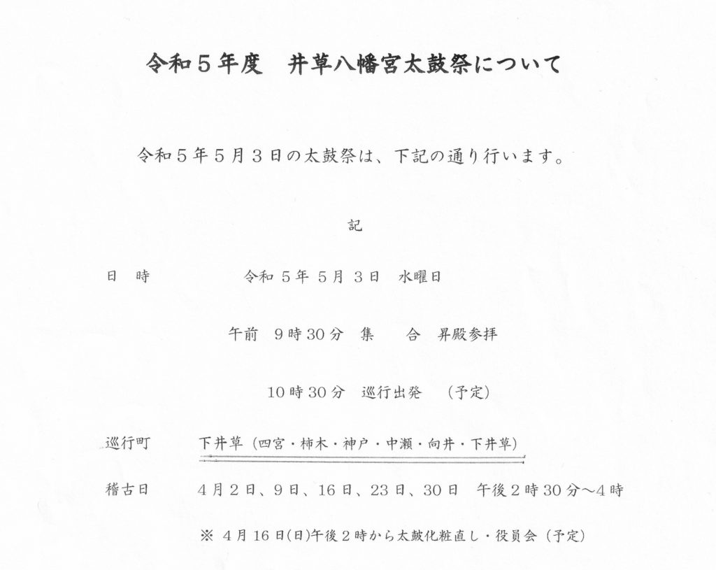 令和5年度 井草八幡宮太鼓祭が5月3日(水)に開催されます。