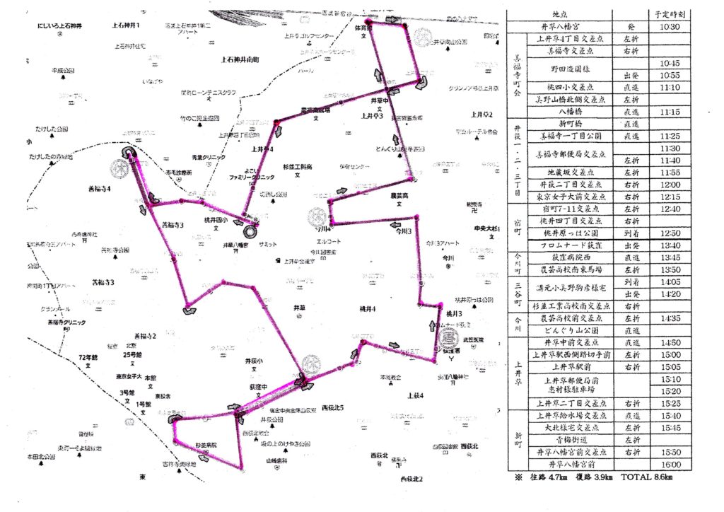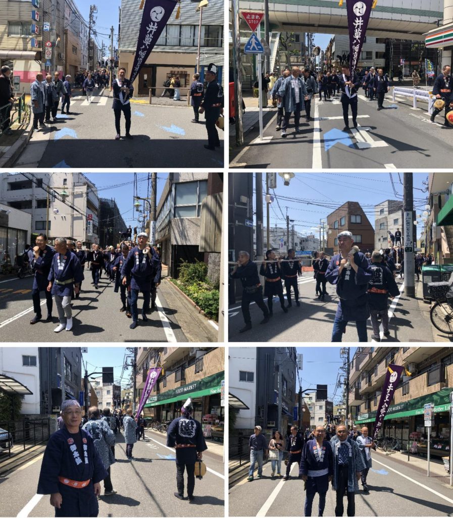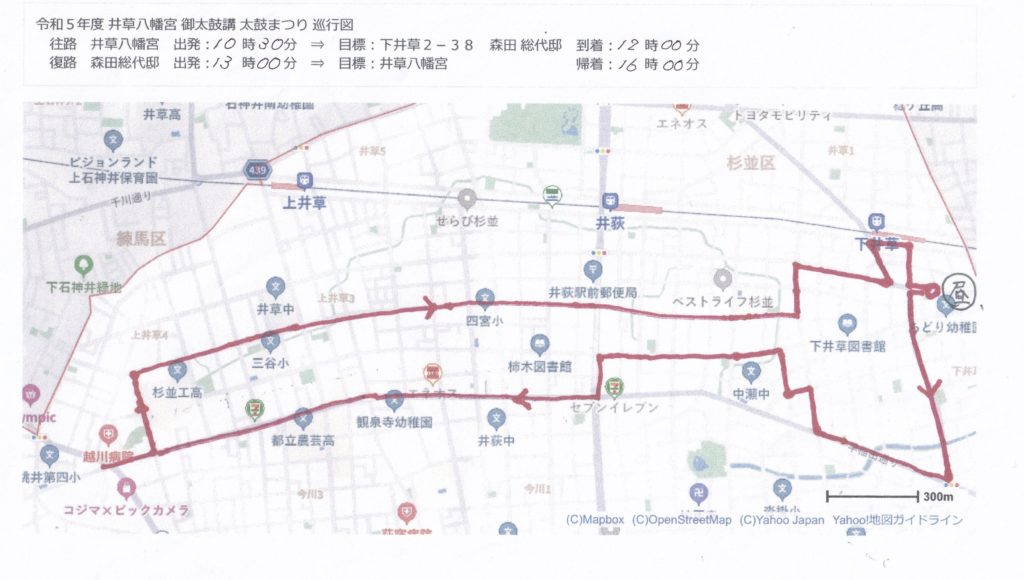 今年度は、井草八幡宮より井草中学校通りを下井草に向かう途中、四宮集会場の前を巡行いたします。おおよそAM11:00頃に通過予定です。