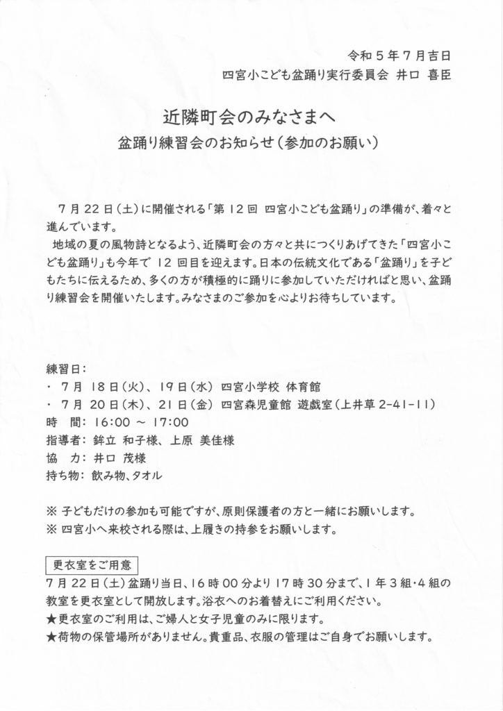 夏休み中も四宮小学校校庭が改修工事のため開催場所が心配されていましたが、地域の学校間の連携や地域のご協力で、今年は場所を「井荻中学校アリーナ」で開催します。