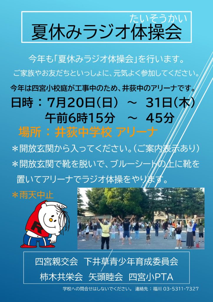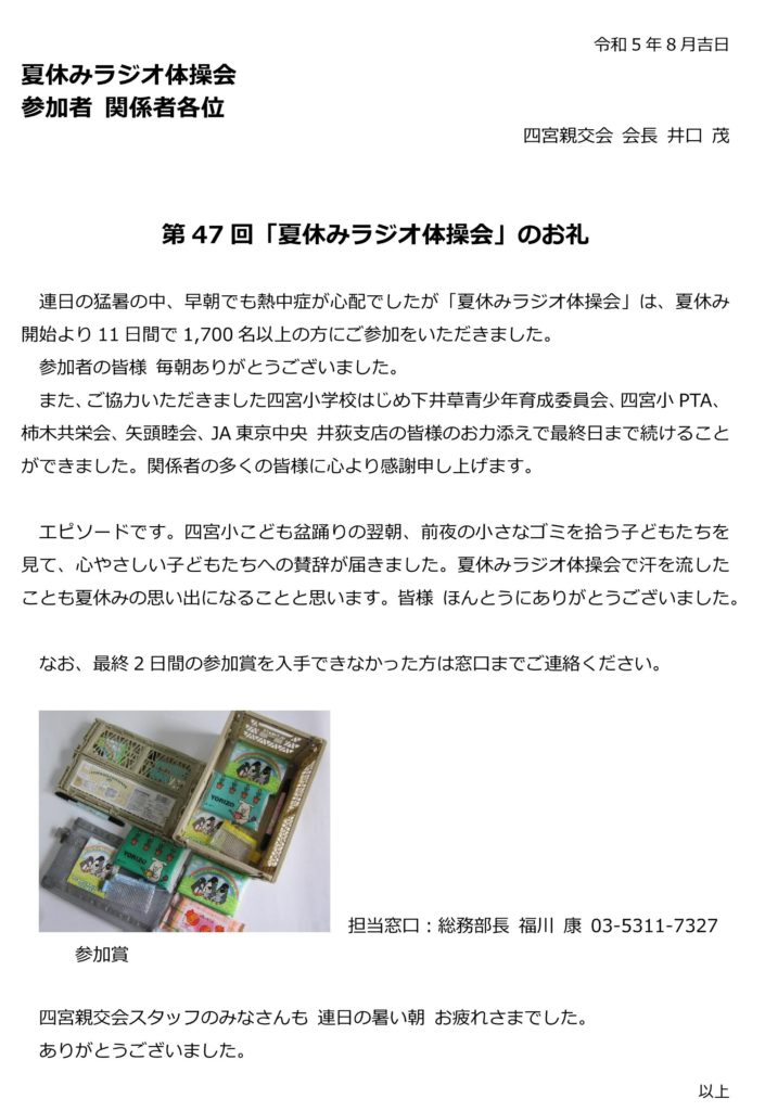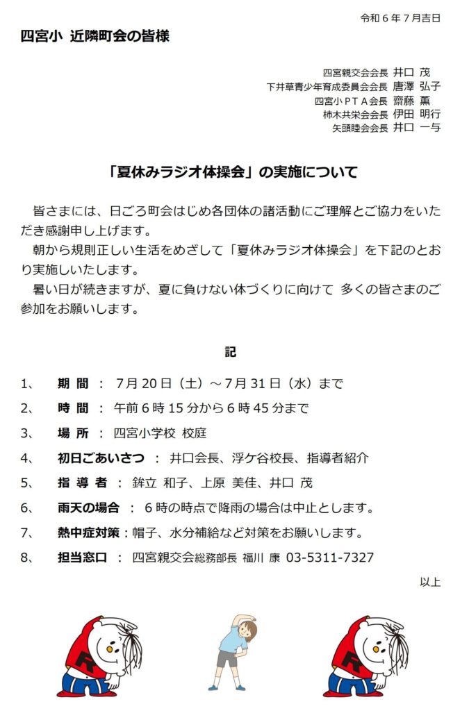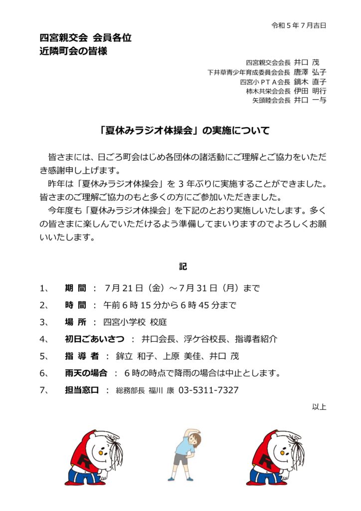 夏休みラジオ体操会 窓口 四宮親交会 総務部長 福川 康