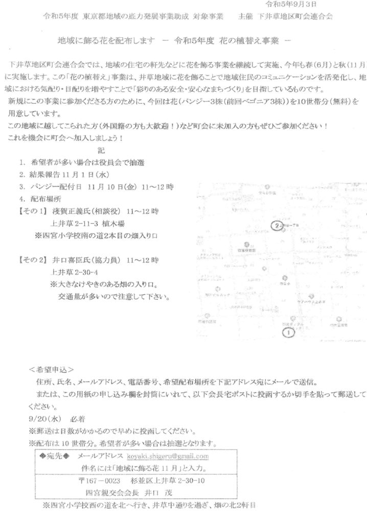 令和4年9月吉日 四宮親交会 会員各位 四 宮 親 交 会 会長 井口 茂 「花の植替え事業」への新規ご参加のご案内 日頃は町会の事業に大変深いご理解をいただきありがとうございます。 6月、11月に「花の植替え事業」を下井草地区町会連合会で実施しています。 花は眺めるだけでなく防犯の観点からも道路にプランターを設置し、町内美化および地域の防犯への抑止力を高めるご協力をいただいております。 長く本事業にご理解とご協力をいただいている方々に感謝申し上げます。 今回、新規でプランターを設置いただき「花の植替え事業」にご参加いただける方を募集いたします。 「花の植替え事業」の趣旨 ねらい:会員の方々に街の花咲かせにご協力をいただき、地域の防犯にも役立てる。 裏面のお知らせもご覧ください。 配布日:6月上旬と11月上旬ごろ(年2回) 配布場所:町会内 ①井口喜臣さん宅、②浅賀正義相談役宅 花の種類:ベゴニア、パンジーなど 条件:プランター設置場所が道路に面し、花を育てることができる。 経費:無料(プランタ―2個まで) 花、腐葉土、肥料、プランターなど東京都地域の底力再生事業の補助金で実施。 7. 新規申込受付窓口:下記 福川康まで氏名、住所など電話、メールでお願いします。 【 締切りは9月25日まで 】 【担当窓口】■四宮親交会:総務部長 福川 康 杉並区上井草2-2-9電話5311-7327 メールアドレス:yasushi.fukukawa@nifty.com 令和4年度 秋 花の植替え事業についてのお知らせ 昨年まではオリンピック、パラリンピックに向けて街の美化と防犯取組の意識向上として実施してきました。 今年度からは、「多文化共生社会づくりにつながる活動」として東京都からの助成を受けています。 多文化共生社会づくりとは・・・ 近年様々な国籍の方が各地域に住むようになりました。一緒に安心して生活できるように、お互いに認め合い助け合う地域社会をつくりましょうという趣旨に沿っての取組です。