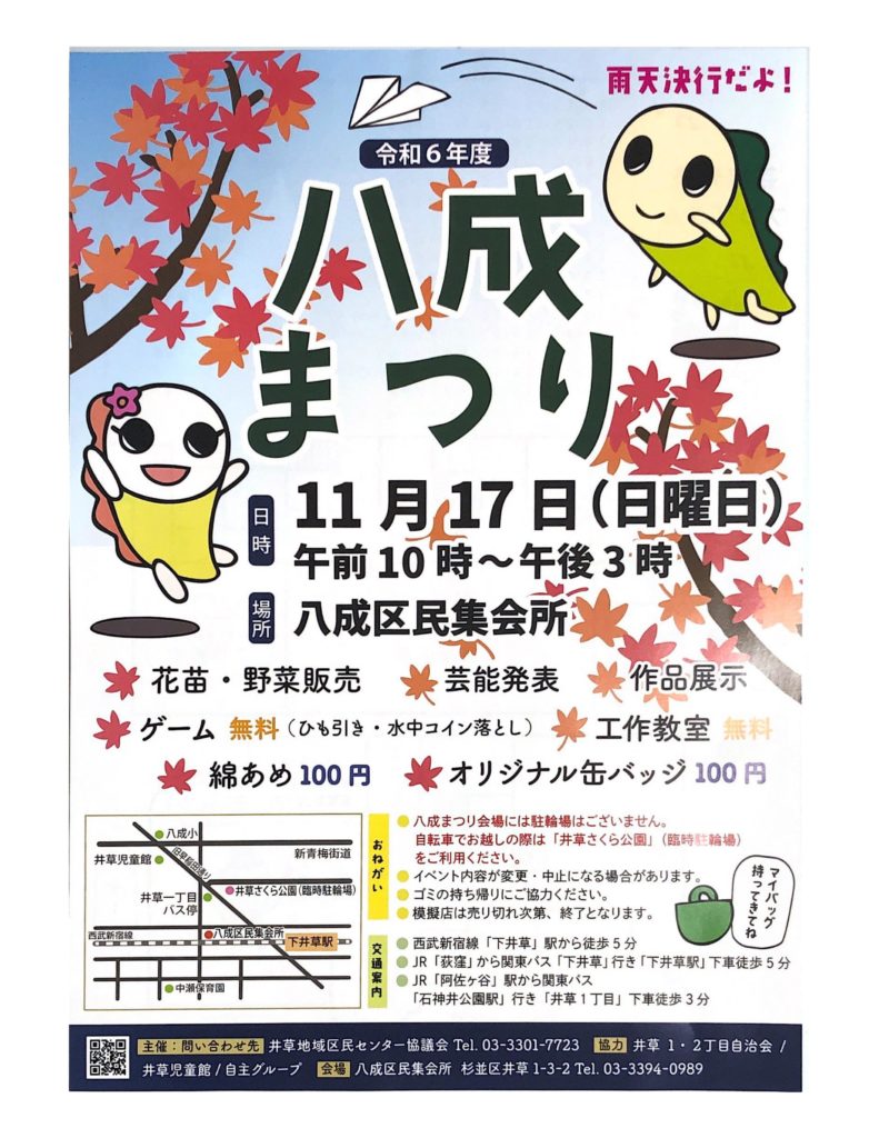 9月8日(日)AM10:00~PM16:00 井草地域区民センターで開催されます。迎え囃子・作品展示・折り紙教室・模擬店・血管、骨密度測定・おもちゃの病院・芸能発表・プラバン、缶バッチ作り・ゲーム などなど沢山の催しがあります。是非ご来場ください。
