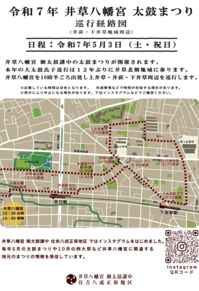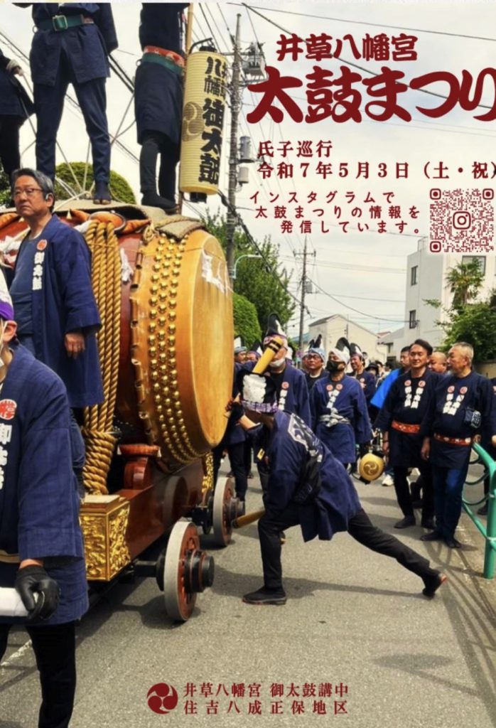 令和7年5月3日(土・祝日)「井草八幡宮 太鼓まつり」が上井草・四宮・矢頭・井荻・下井草北・井草1.2丁目を巡行いたしました。沿道には大勢の方々が見学され大きな大太鼓の音色におどろいていました。威勢の良い大太鼓の音色を聴くと「家内安全」「無病息災」と言われ縁起の良い事とされています。写真と動画を掲載いたします。音色を聴いて幸運を招いてください。