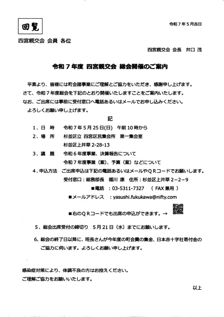 5月25日(日)午前10時から四宮区民集会所第一集会室にて「令和7年度 四宮親交会総会」を開催いたします。ご出席の申込は、5月21日(水)までに、下記案内に記載の電話・メールアドレス・QRコードから総務部長 福川 康までお願い申し上げます。
